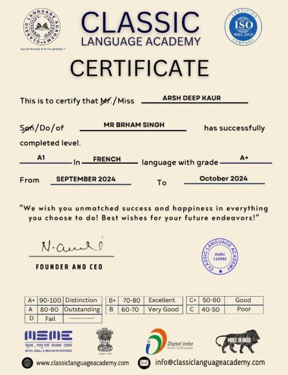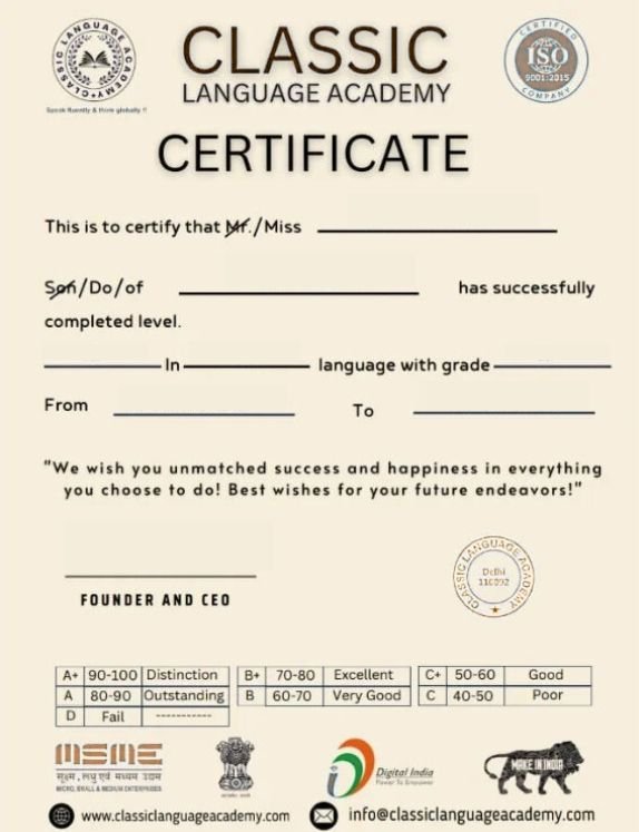 Classic Language Academy is proud to be recognized by prestigious national bodies, including Start-up India, Digital India, MSME, and Make in India, and is an ISO 9001 certified institution. These accreditations are a testament to our unwavering commitment to the highest standards of educational excellence and operational integrity. This national recognition provides our students with a trusted assurance of quality, opening doors to premier career opportunities with esteemed Indian companies and multinational corporations.
